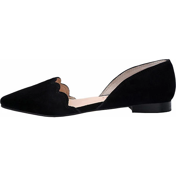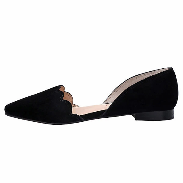 Wunderschöner Ballerina aus weichem Veloursleder. Wirkt durch die offen gearbeitete Seite und die Wellenform sehr elegant. Super bequeme Komfortlaufsohle mit süssem Herzchen. Einfach schön – sowohl zu Blue Jeans als auch zu festlichen Kleidern und Röcken.