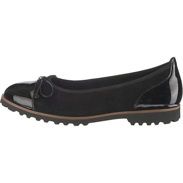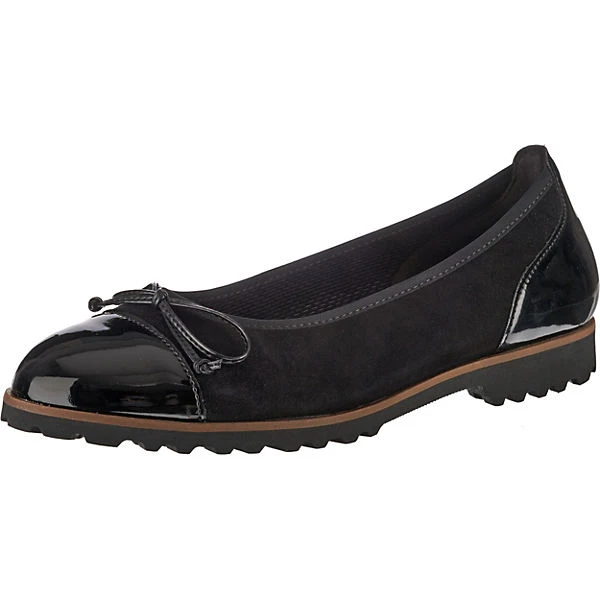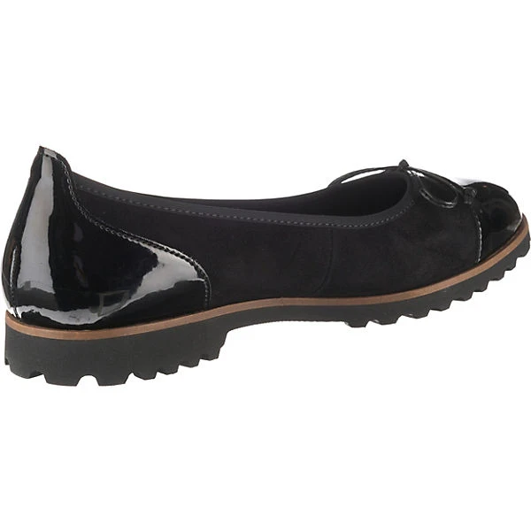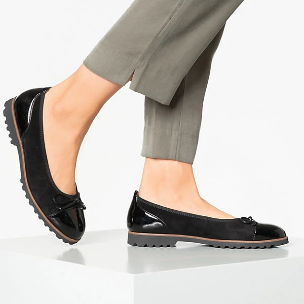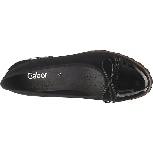 Diese klassischen Ballerinas von Gabor sind aus einem Echtleder-Obermaterial gefertigt und zeigen sich mit einer Schleifen-Applikation auf der Vorderkappe. Das geringe Eigengewicht und die gepolsterte Decksohle mit Perforationen für ein gutes Feuchtigkeitsmanagement unterstützen den Tragekomfort.