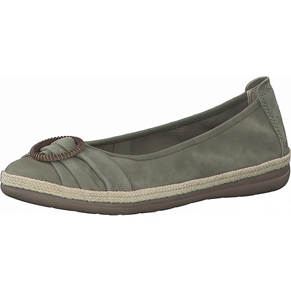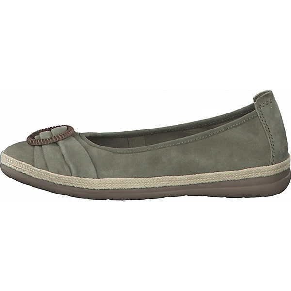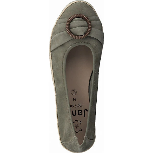 Die Ballerinas der Marke Jana sorgen stets für einen perfekten Auftritt. Das Modell kommt ohne jeglichen Verschluss aus, sodass im Handumdrehen hineingeschlüpft werden kann. Das Fußbett besteht aus atmungsaktivem Leder, das ein komfortables Tragegefühl begünstigt. Das Obermaterial ist aus Echtleder.