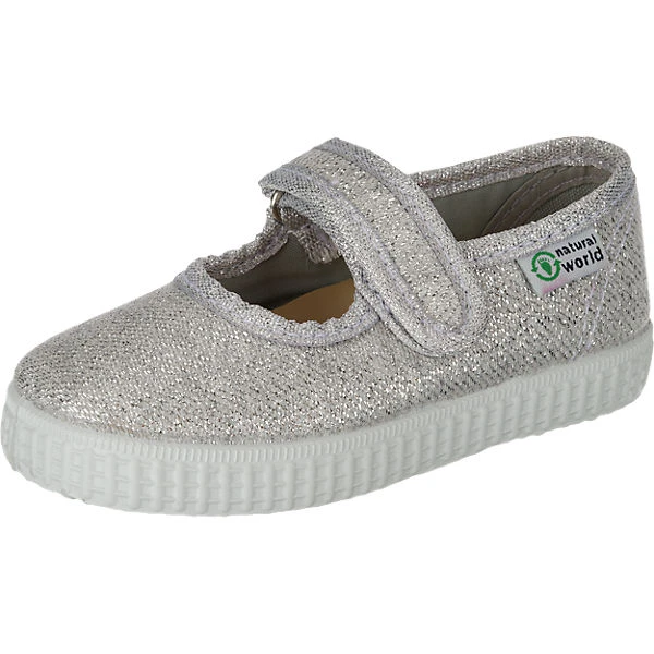 Entzückende NATURAL WORLD Kinder Ballerinas mit metallisch glänzendem Effektgarn. Der praktische Klettverschluss sorgt für eine angenehme Passform und viel Halt.
