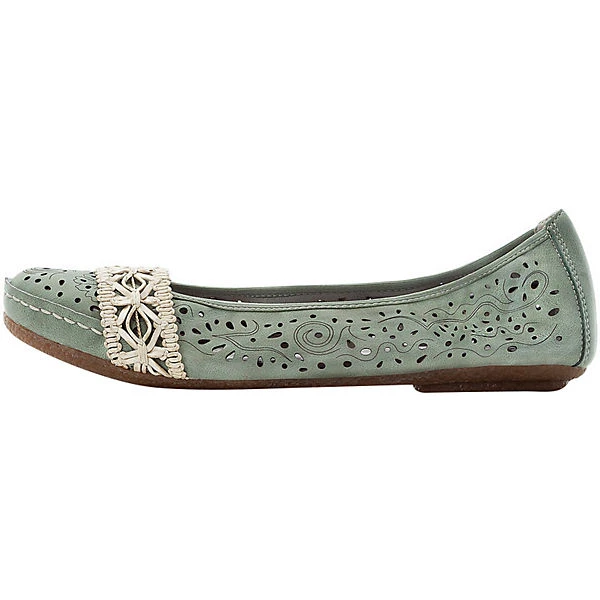 Rieker Damen Ballerinas Grün Kunstleder – Raulederoptik – Lochstanzmuster – zierender Flechtriemen über Spann – verstärkter Fersen- und Zehenbereich – leicht gepolsterte Decksohle – flexible, rutschhemmende Laufsohle